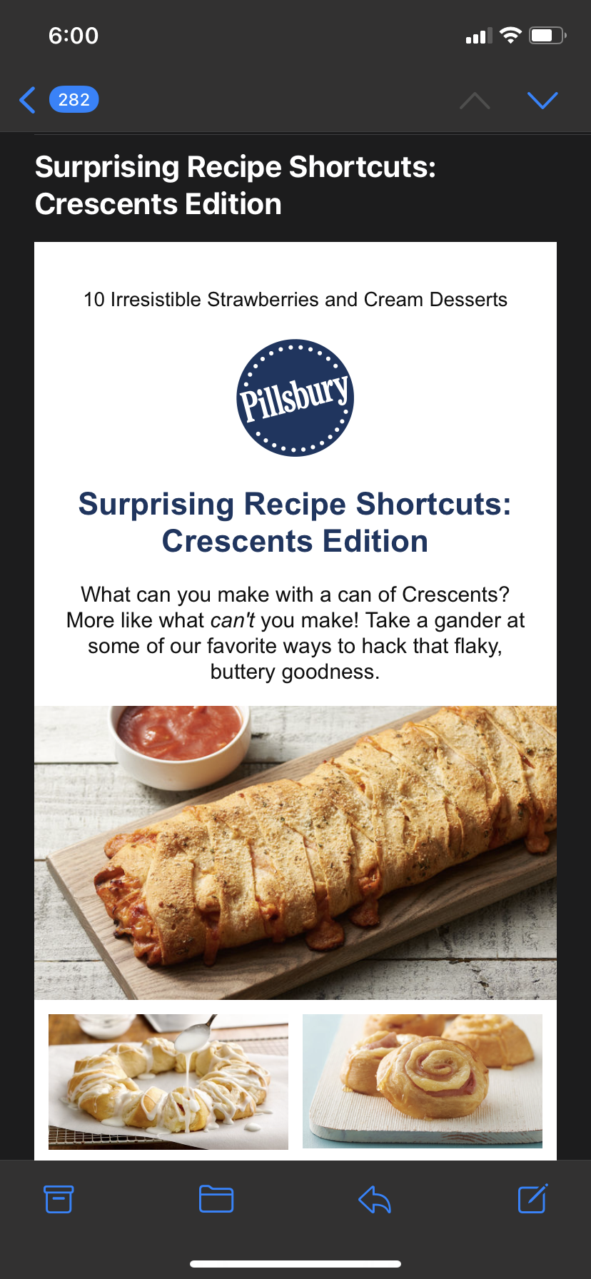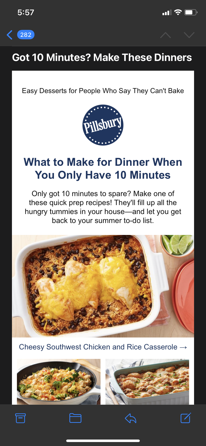 During my time at Ingredient, a marketing agency that specializes in the food industry, I wrote email copy for Pillsbury. I collaborated with a team of content planners, designers, and campaign managers to produce daily email sends that drove the brand’s target consumers to the site and met traffic goals year over year.