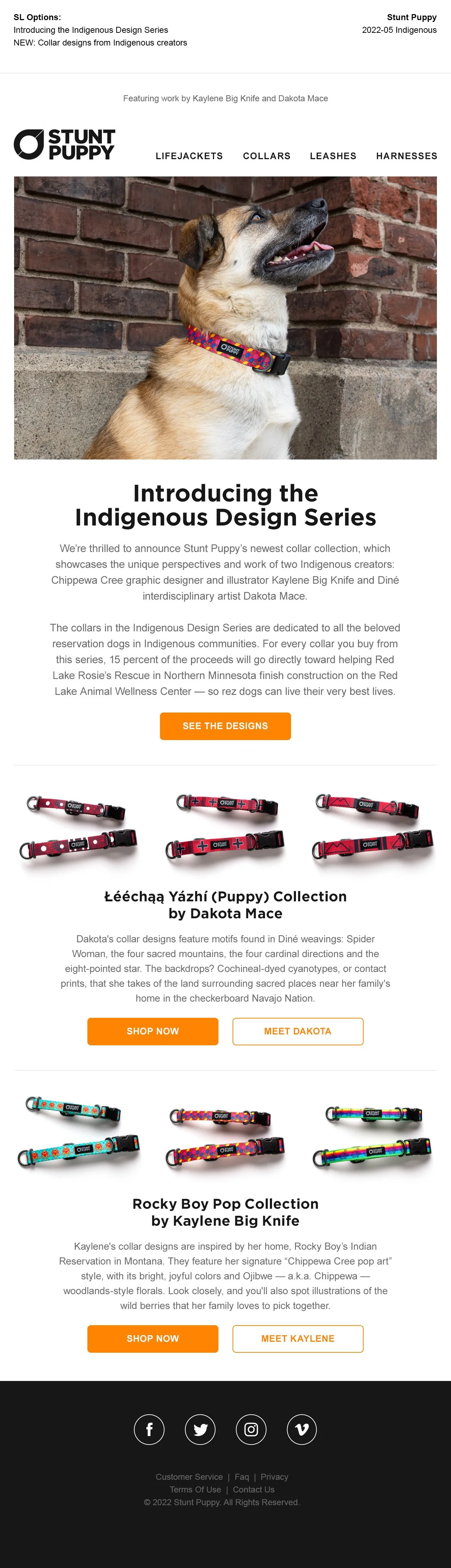 As lead copywriter with Stunt Puppy, I wrote email and site content for the project — including Q&A features with Kaylene and Dakota to help tell their stories as artists and dog lovers. The Q&As are no longer online, but you can read excerpts of the introductions below.
